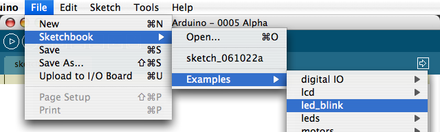 maintenant, nous allons choisir un programme simple et le charger sur la carte. Aller dans le menu " file > Sketchbook > Examples > led_blink " ce qui devrait sélectionner le programme suivante :