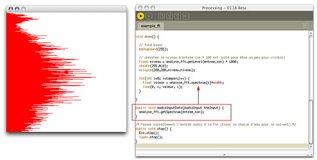 Le FFT, en gros, vous donnera non pas une valeur, mais un ensemble de valeurs de l'entrée audio. Vous trouverez un excellent exemple en ligne (inputFFT) sur le site d'Ess, avec les codes sources (InputFFT.pde). Par contre, ce code est un peu compliqué. Voici une simplification de cet exemple, en gardant notre exemple de niveau sonore comme squelette :