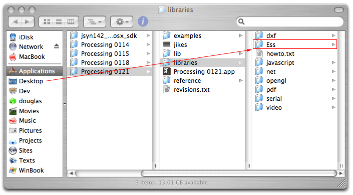 Processing ne sait pas d'office faire des programmes de ce genre. mais ce n'est pas un problème pour nous, parce que nous avons des dixaines de bibliothèques externes disponibles pour accroître ses possibilités. En plus, ça tombe bien, parce que, comme vous êtes plutôt bon élève, vous avez déjà lu l'article sur l'utilisation des bibliothèques externes dans Processing : vous êtes prêt à aller sur le site de ESS, à cliquer sur " download ", et à l'installer dans votre bibliothèque personelle de Processing. Eh? Quoi? Vous n'avez pas encore lu ce cours ? Oh, ce n'est pas grave, il explique juste qu'il faut copier le dossier Ess dans le dossier libraries de Processing, comme ceci: