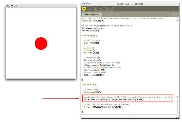 Après tout le bordel d'avoir activé Ess (import), de l'avoir démarré (Ess.start(this)), et puis d'avoir tapé des codes étranges (.getLevel(entree_son)) pour récupérer le niveau, enfin nous avons une variable simple, niveau qui contient un chiffre réel. Il suffit maintenant de juste l'utiliser dans notre programme :