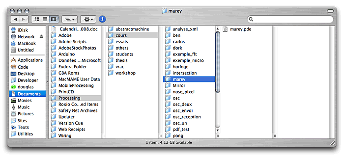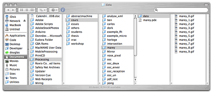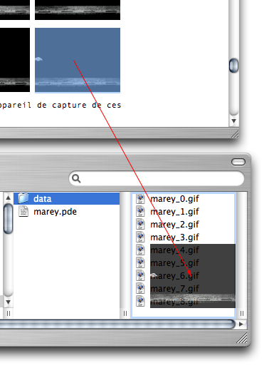 Sur macintosh, ce procédé est relativement sans difficulté. Il suffit de saisir chacune des images avec la souris et de les trainer dans le dossier data de votre Sketch. Vous pouvez également sauvegarder chaque image sur le bureau via clic-droit ou ctrl-clic. Il y a tellement de façons de peupler un dossier d'image, que je ne veux pas vous ennuyer en les illustrant toutes ici. Une bonne base du fonctionnement de votre ordinateur devrait suffire. mais si toutefois vous rencontrez des difficultés - ou si vous êtes de nature impatient(e) -, vous pouvez toujours télécharger une copie de ce Sketch tout à la fin de ce cours.