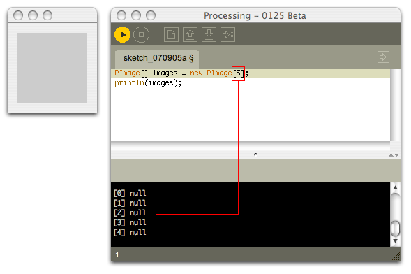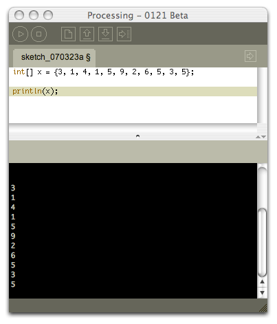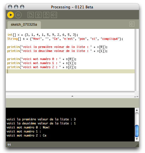 Ce qui est pratique avec la fonction print(); c'est qu'elle permet de lire notre liste (3, 1, 4, 1, 5, 9, 2, 6, 5, 3) un peu mieux que l'exemple précédent. En ajoutant juste des espaces entre les valeurs, on peut du coup lire encore plus facilement le contenu d'une liste dans la console de Processing. (depuis Processing 0125, on ne peut plus imprimer une liste de cette façon).