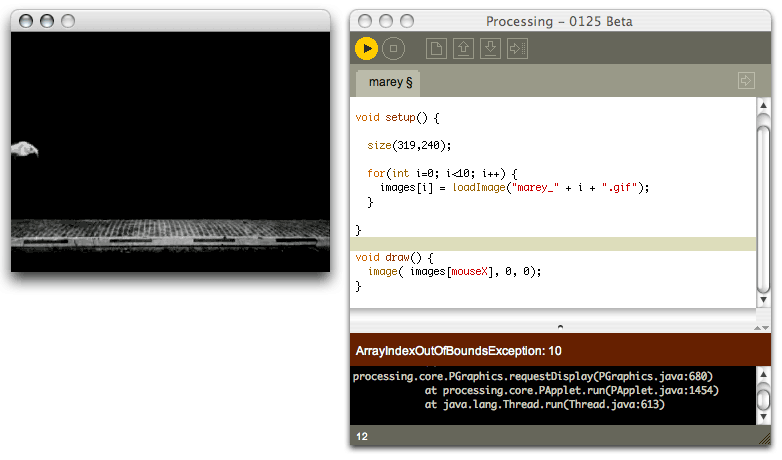 Hmmm... " Array Index Out Of Bounds ", je me demande si l'ordinateur veut dire que j'ai essayé d'accéder au onzième élements de la liste, alors qu'il n'y en a que 10. Eh bien, oui. Effectivement, si vous tentez de lire en dehors du nombre réservé pour la liste, votre programme va planter. J'ai placé ma souris à la position mouseX = 10 et il n'existe pas d'image à la positionimages[10]! J'ai cherché à lire dans un endroit de la mémoire qui n'existe pas. Et comme Java ne veut pas que je finisse par déborder mon programme et lire dans les variables d'un programme voisin (c'est comme ça d'ailleurs que beaucoup de virus s'opèrent), il a préféré tout simplement faire planter mon Sketch.