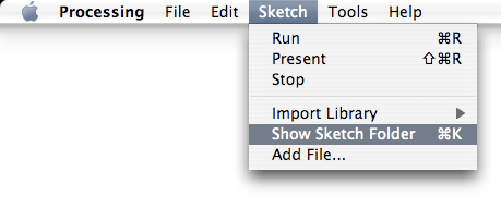 Nous allons maintenant créer un sous-dossier dans notre Sketch qui contiendra toutes nos images. Si vous avez oublié comment travailler avec des images dans Processing, je vous recomande un petit retour vers le chaptire 06 : Images Photographiques. Pour retrouver le dossier de votre Sketch, sélectionnez dans le menu Processing Sketch > Show Sketch Folder :