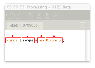 mais cette fois-ci, nous allons utiliser une nouvelle méthode pour la déclaration de notre liste. On va d'abord construire une liste d'emplacements vides, puis les remplir plus tard dans le setup(). Pourquoi? Dans le cas des images, cette procédure en deux parties est essentielle car nous ne pouvons pas mettre directement entre accolades { } tous les pixels des images dont nous avons besoin. Les images ne peuvent être chargés qu'avec la fonction loadImage("nom_du_fichier.jpg"); et celle-ci ne peut pas être écrite entre accolades. Il faut dans ce cas créer une " nouvelle " liste avec le nombre d'emplacements reservés pour les contenus d'images, et puis charger chacune de ces images dans le setup() avec la fonction loadImage().