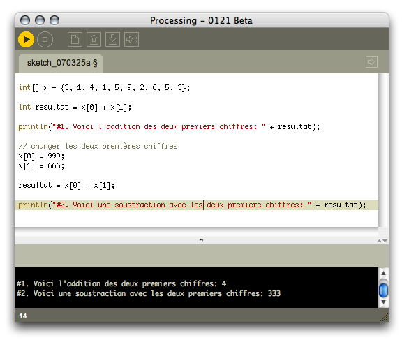Dans le programme suivant, nous avons par exemple une série de chaînes de caractères (String) qui sont affichés de deux différentes manières à l'intérieur de la console Processing: