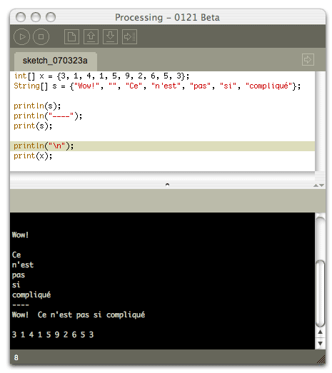 D'ailleurs, à ce sujet, vous pouvez également utiliser la fonction print(x); pour afficher une liste, ce qui évitera d'avoir un retour-chariot entre chaque valeur de votre liste. (depuis Processing 0125, on ne peut plus imprimer une liste de cette façon).