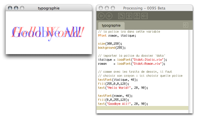 Et si nous voulons écrire avec deux différentes formes typographiques, il suffit de charger deux polices et de passer à l'un et à l'autre comme s'il s'agissait d'un changement de couleur de crayon :