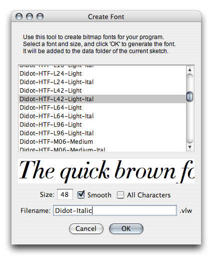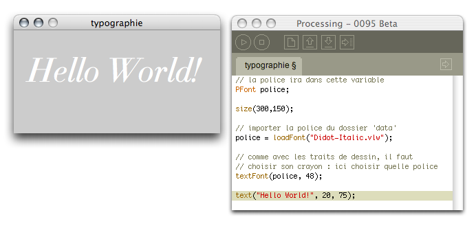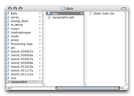 Si vous voulez savoir pourquoi ce fichier se termine en .vlw, il s'agit d'une référence au [Visual Language Workshop](https://fr.wikipedia.org/wiki/Visual Language Workshop) tenu par [muriel Cooper](https://fr.wikipedia.org/wiki/muriel Cooper), le professeur de [John maeda](https://fr.wikipedia.org/wiki/John maeda). Comme Processing est un projet issu du [mIT media Lab](https://fr.wikipedia.org/wiki/mIT media Lab), il était naturel de retrouver les divers origines de l'équipe maeda à travers leur environement de développement. Apparement, en tout cas selon les développeurs, une autre methode d'importation/usage des polices est à l'étude. Pour l'instant, ils se servent d'une technologie déjà mise en place au mIT.